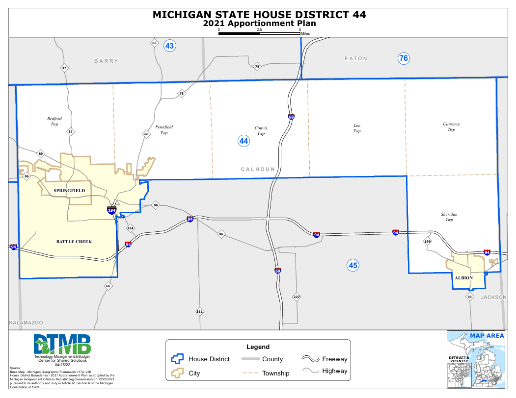 Rep. Frisbie represents the people of Battle Creek, Springfield, Bedford Township, Pennfield Township, Convis Township, Lee Township, Clarence Township, Sheridan Township, and Albion. To confirm that you live in Rep. Frisbie’s district, use the Find My Rep tool.